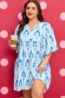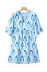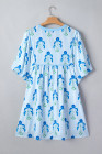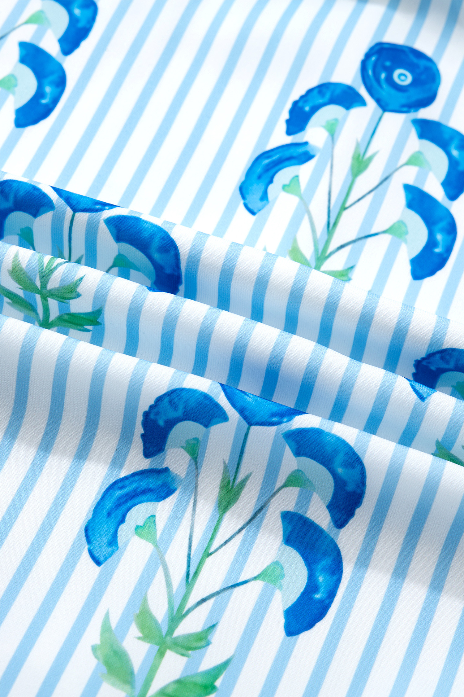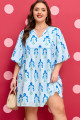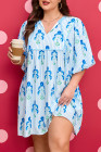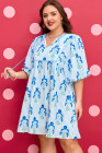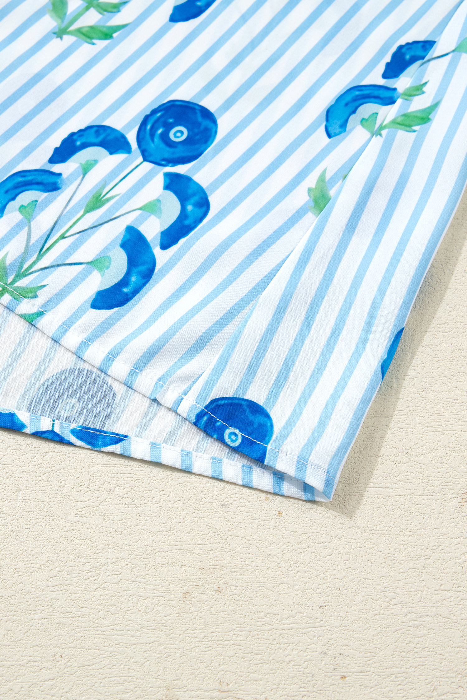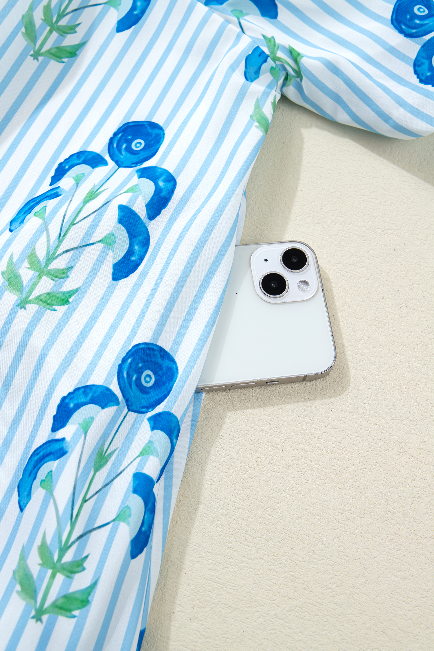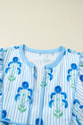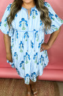 Sky Blue Floral Striped Bubble Short Sleeve Plus Size Dress