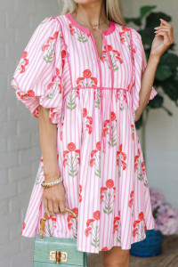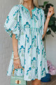 Sky Blue Floral Striped Print Tie Notched Neck Puff Sleeve Flared Mini Dress
