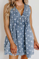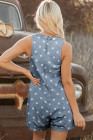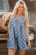 Sky Blue Polka Dot Print Tie V Neck Pleated Loose Denim Romper