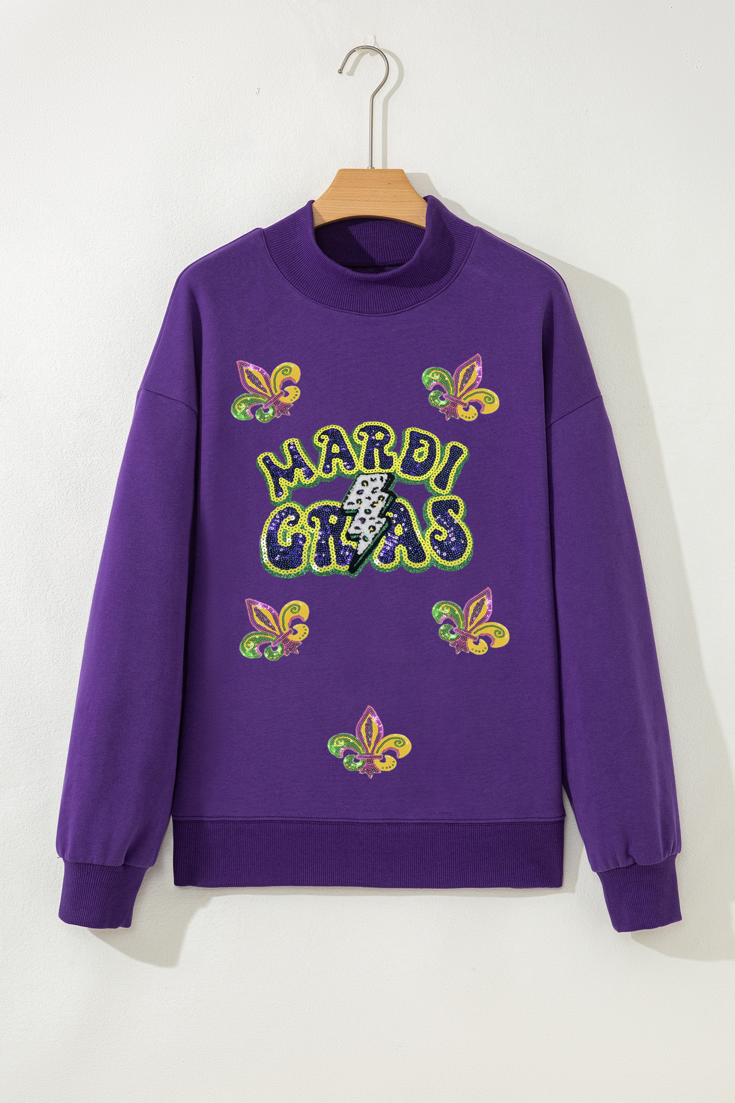Tillandsia Purple MARDI GRAS Leopard Lightning Sequin Graphic Mock Neck Sweatshirt