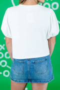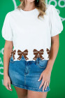 White Game Day Sequin Bow Detail Scalloped Hem Short Puff Sleeve Blouse