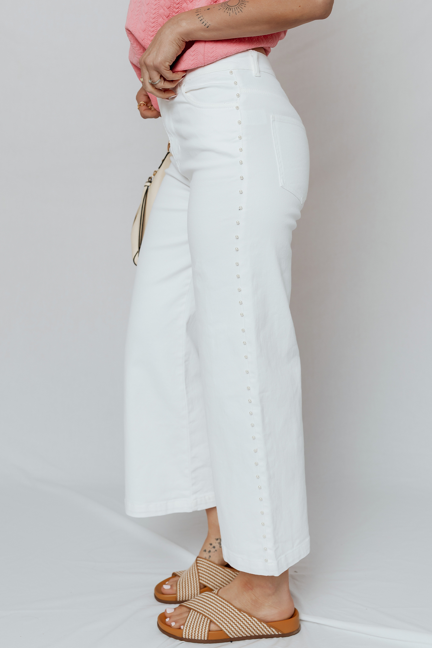 White Pearl Embellished Side Seam Ankle-length Shift Jeans